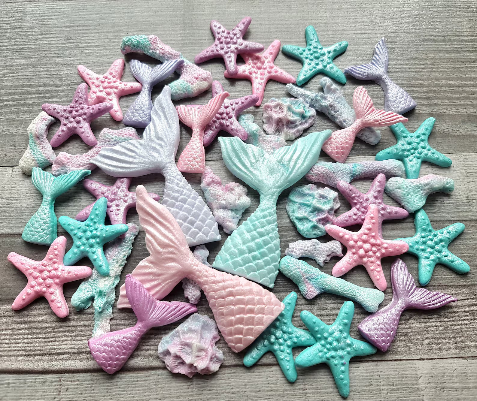 33 edible fondant decorations including shells, starfish, coral pieces and a mermaid tail in assorted shapes and colors.