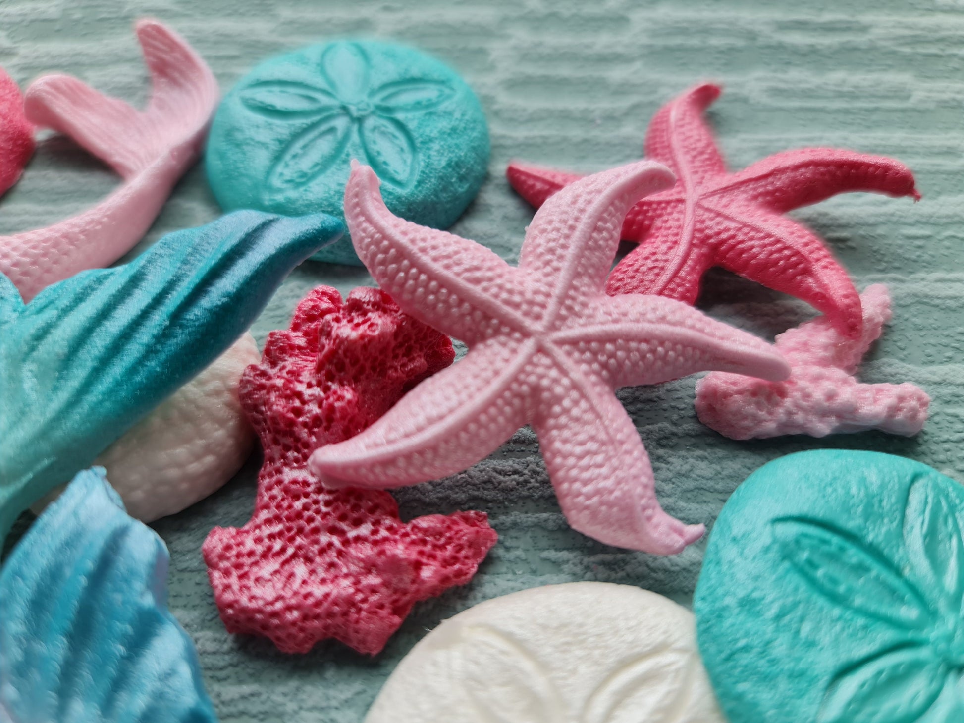 33 pcs. edible sugar fondant shells, corals, mermaid tail, starfish cake topperNo Extra Fees for US Buyers