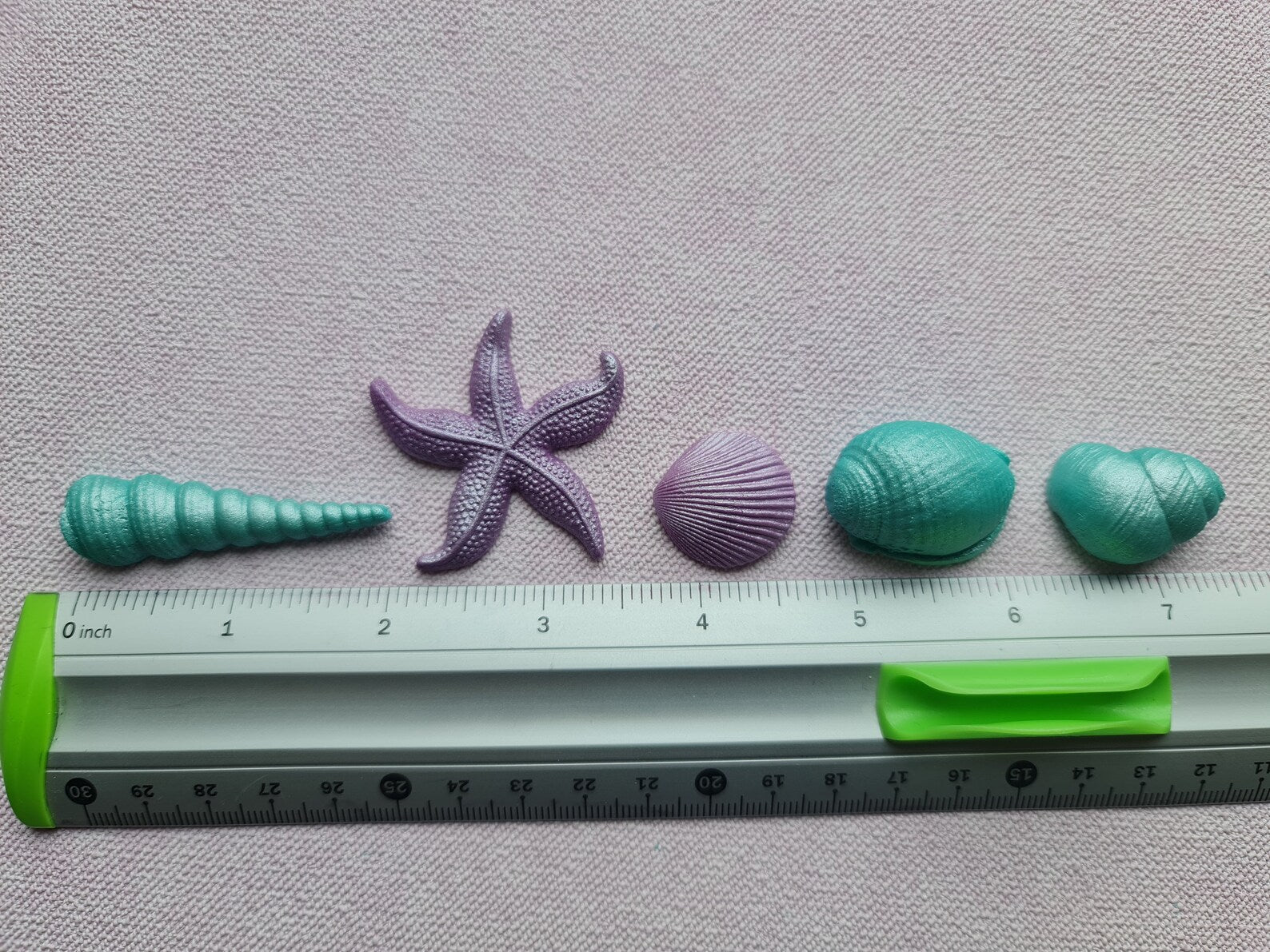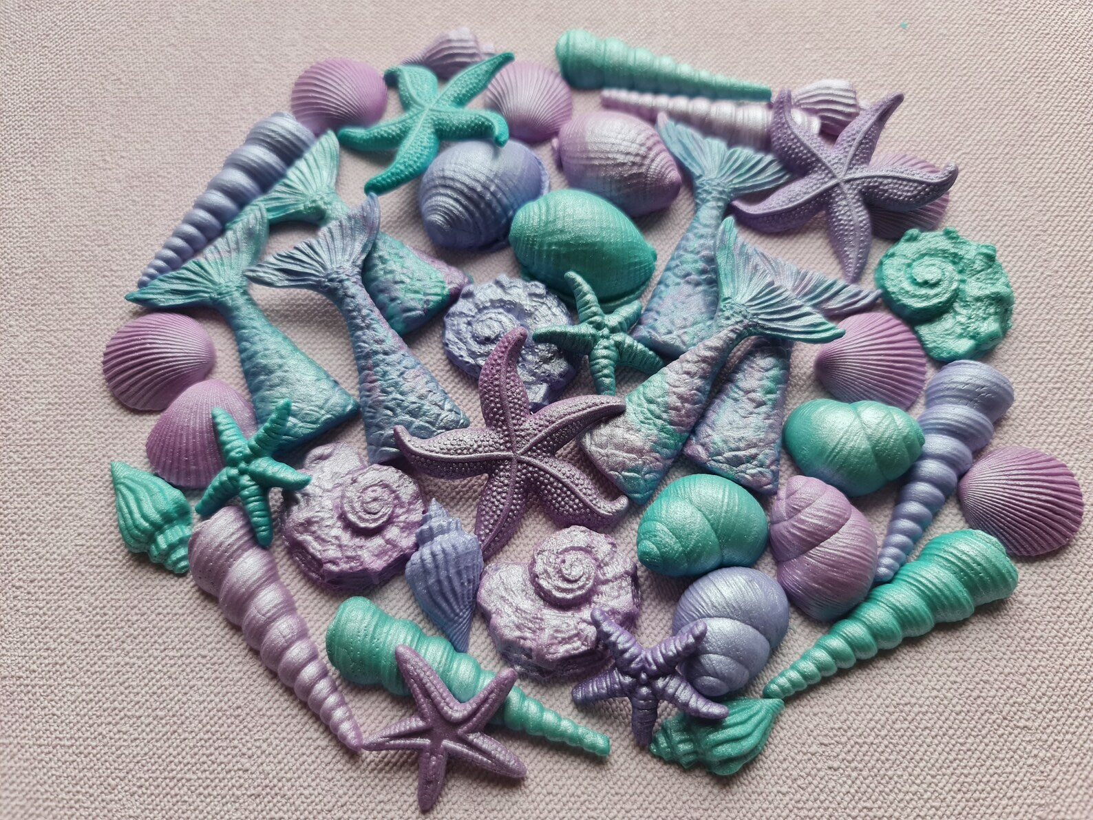 36 edible fondant decorations including shells, starfish, coral pieces and a mermaid tail in assorted shapes and colors.
