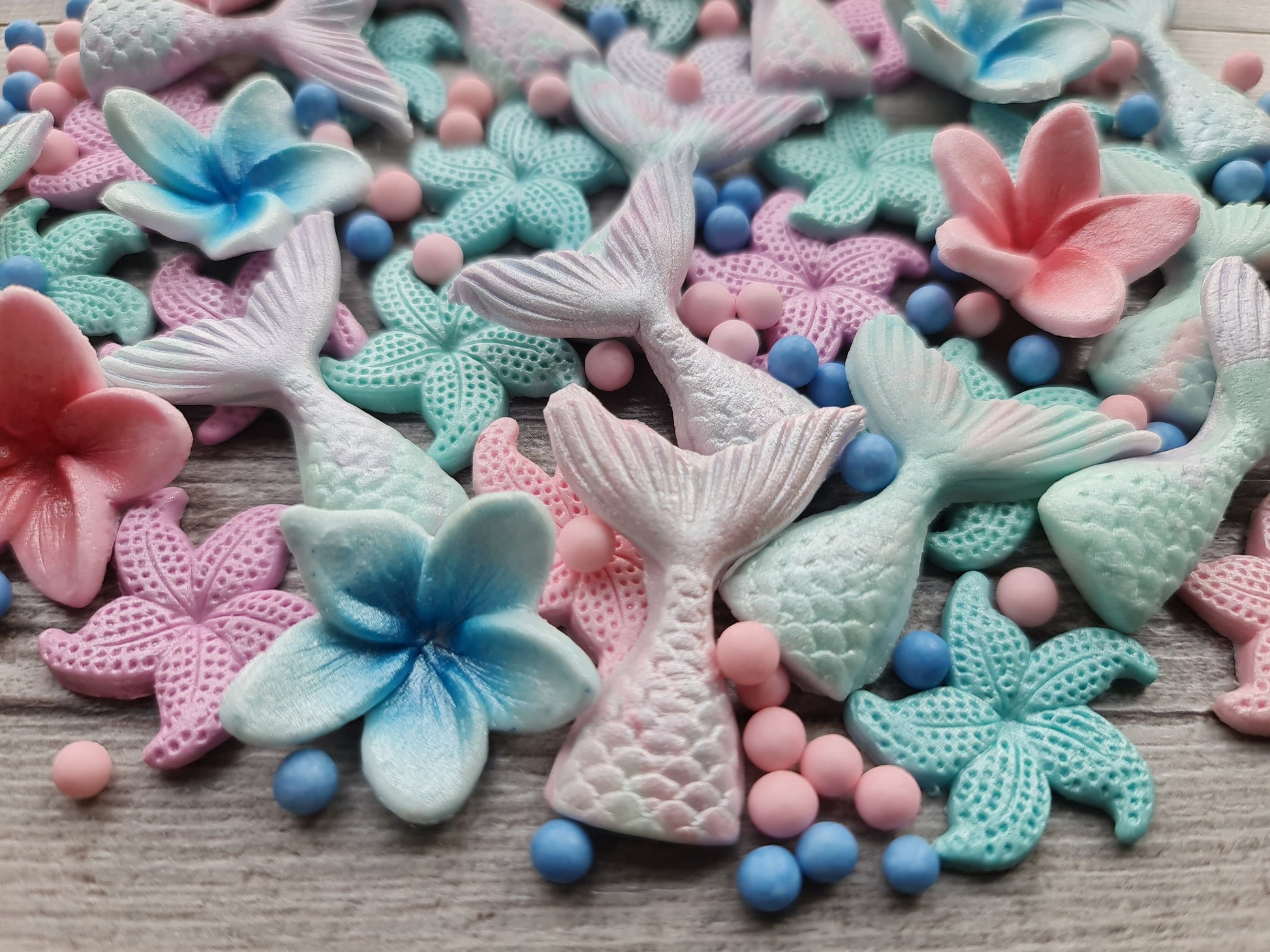 38pcs Mermaid Tail Cake Topper: Fondant Starfish, Plumeria, Pearls
