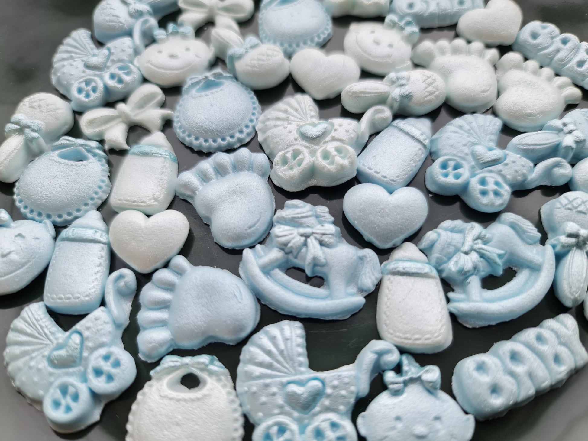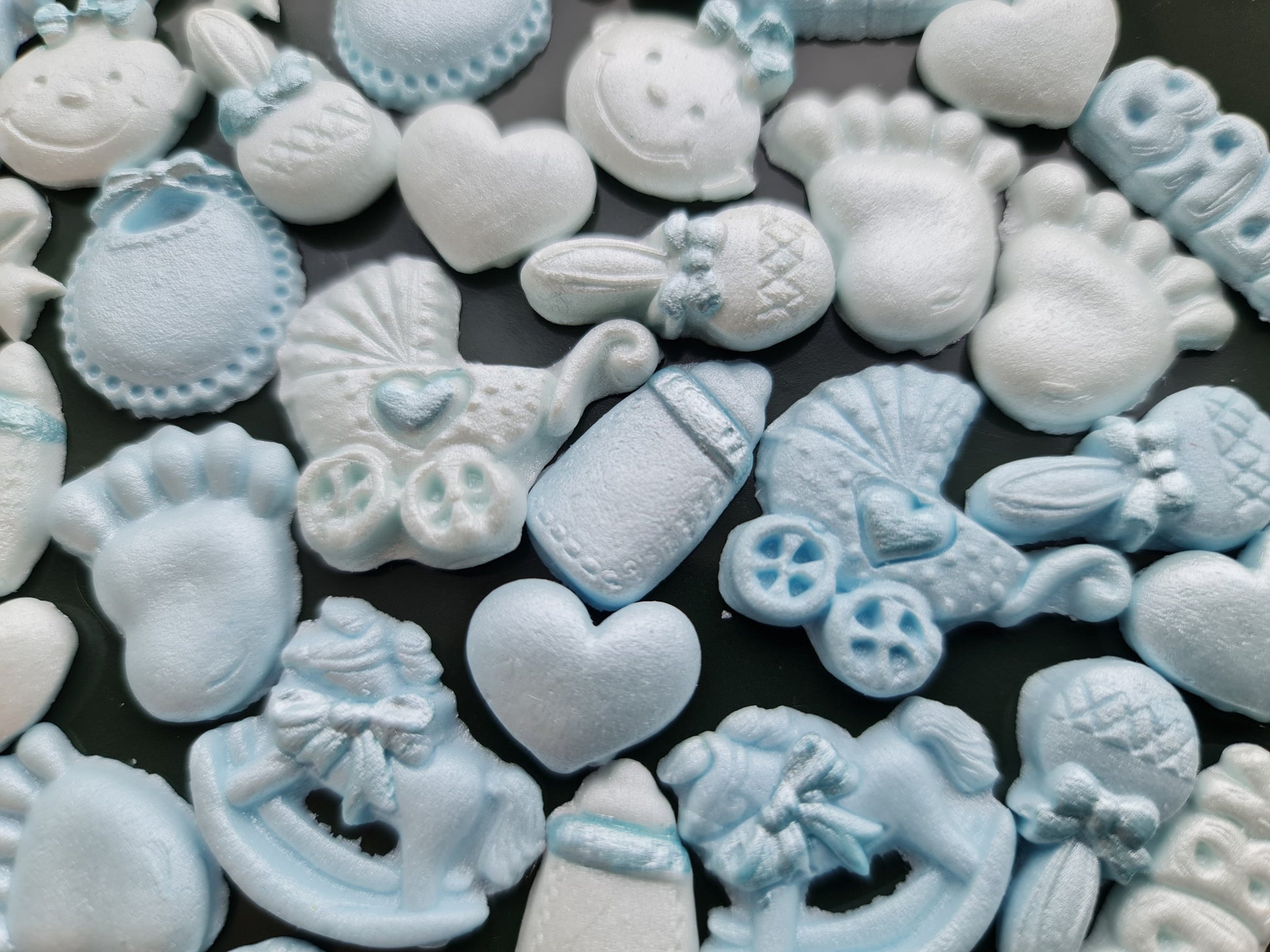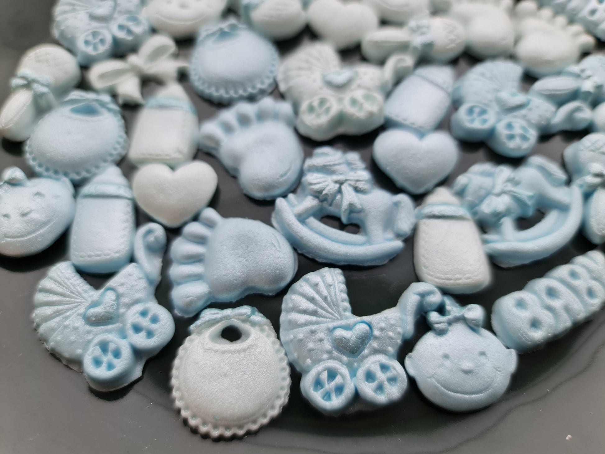 Ingredients: Icing sugar (sugar, 2% potato starch), Guar gum (E412), Xanthan gum (E415), , Water, Color E133, E122* (Humectant: E422, Silicon Dioxide (E551), Propylene Glycol (E1520). Pearl shimmer (colors: E530, Potassium aluminium silicate: E555). Pearlescent Baby Blue (Water, Colours: colors: E530, Potassium aluminium silicate: E555, E133. Corn flour, Emulsifier: SOYA Lecithin. Preservative: E202. Citric Acid).