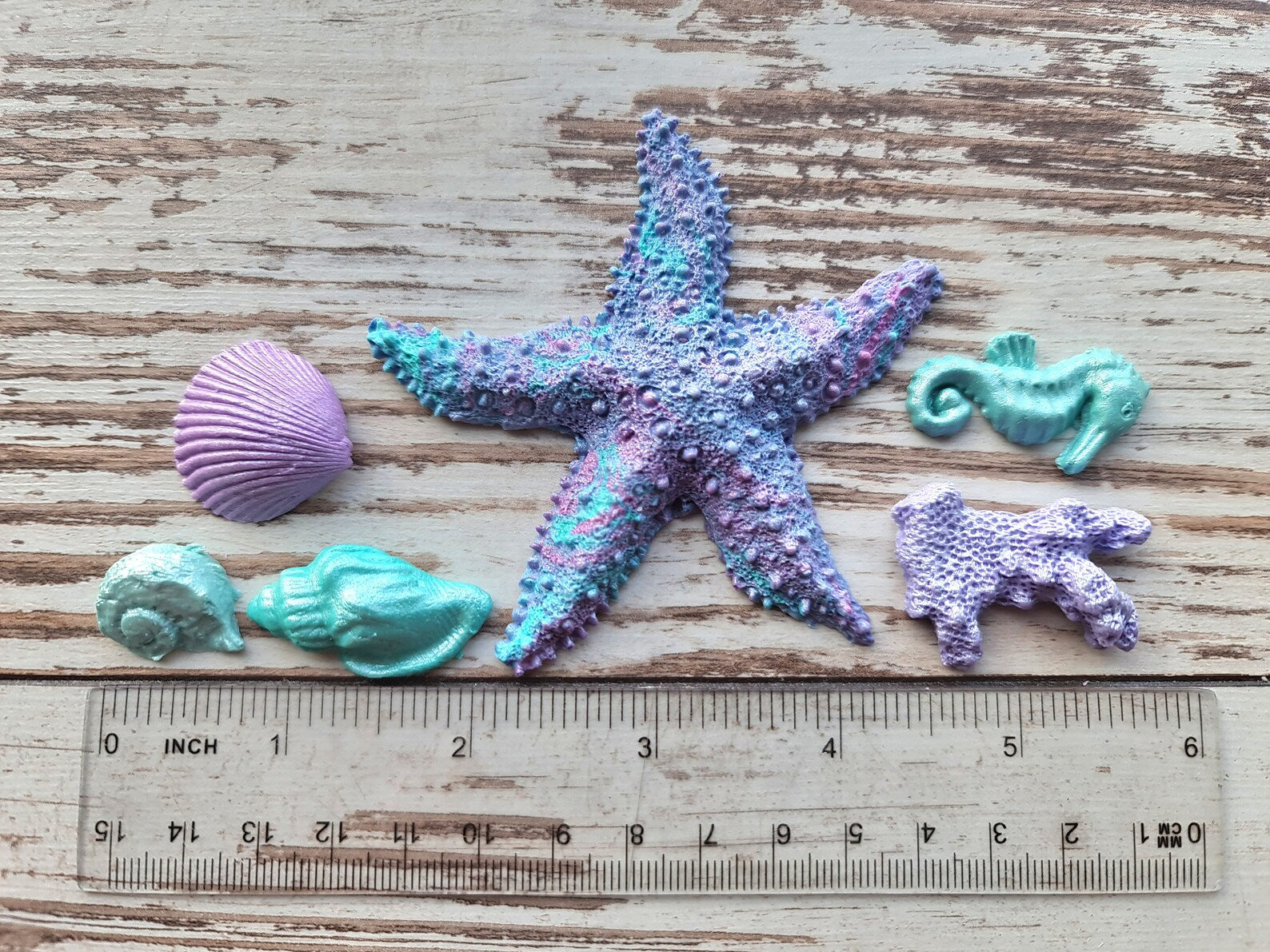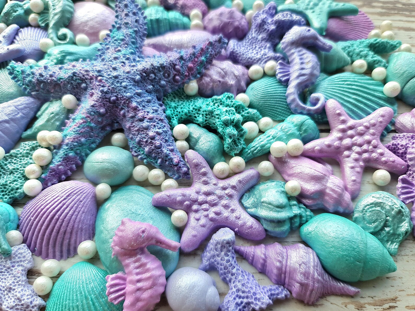 46 edible fondant decorations including shells, starfish, coral pieces and a mermaid tail in assorted shapes and colors.