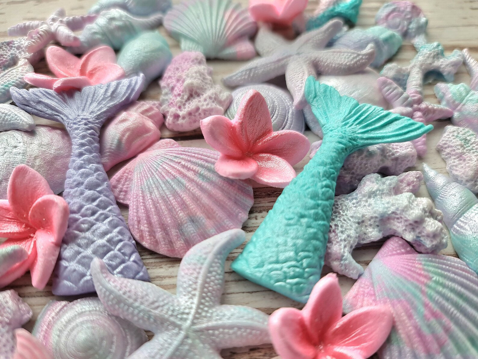 40 edible fondant decorations including shells, starfish, coral pieces and a mermaid tail in assorted shapes and colors.
