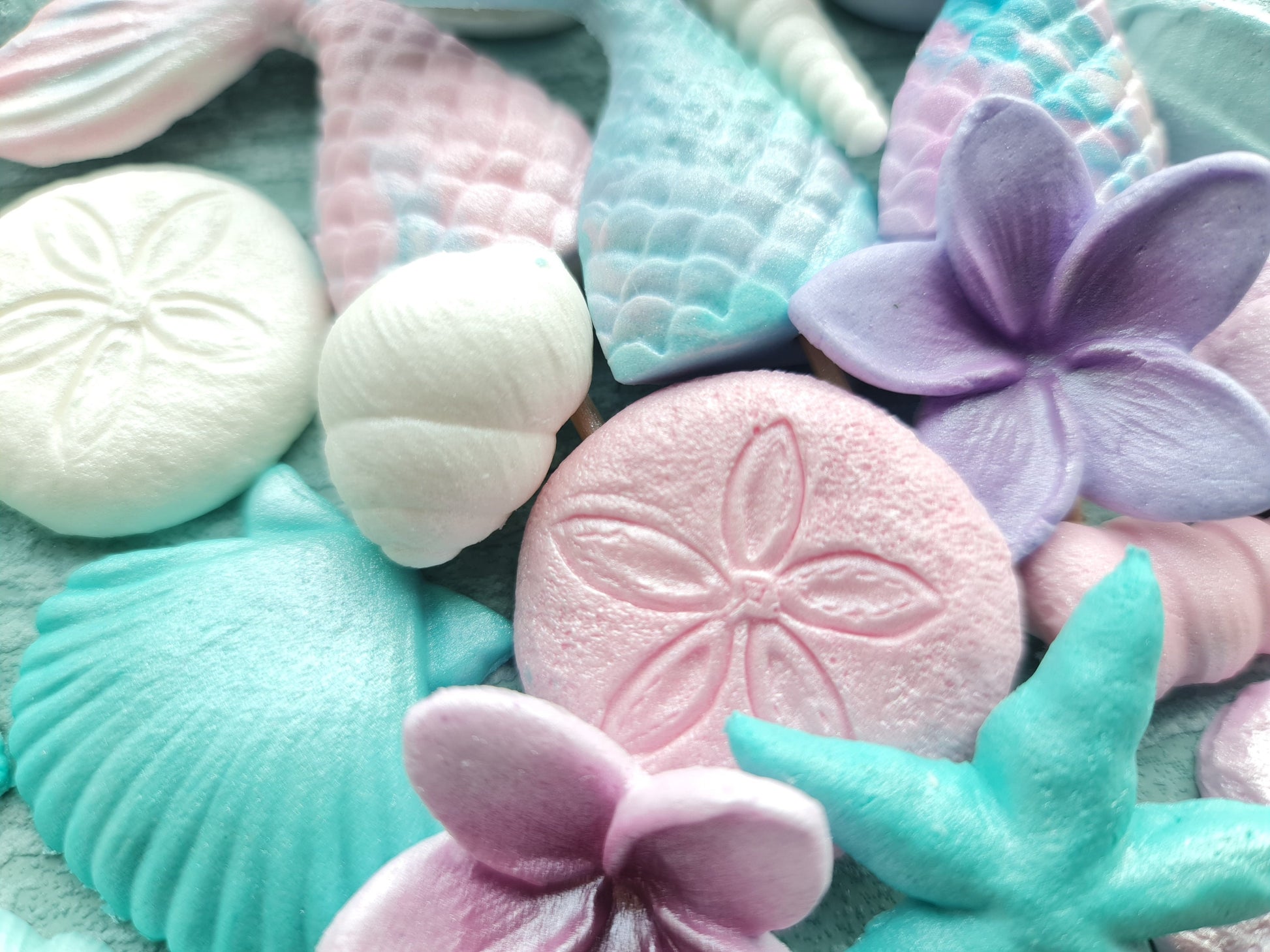 49pcs Sugar Fondant Cake Topper: Seashells, Mermaid Tail, Plumeria
